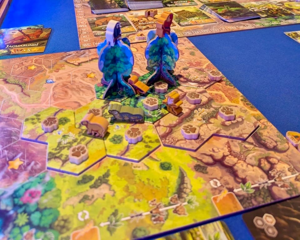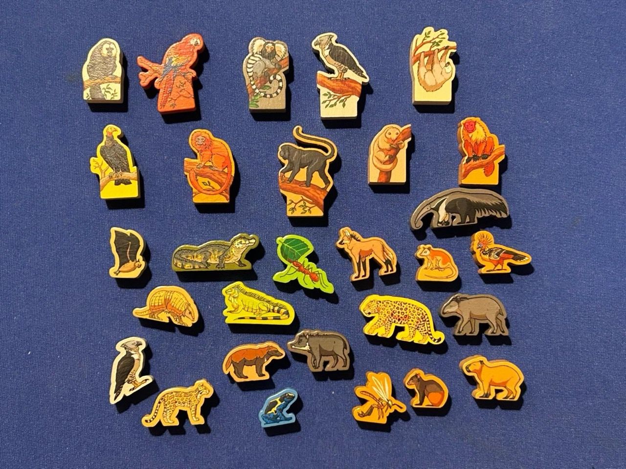 A player board quite near the end of a game. I love how the animal meeples representing animals that can live in high trees in the rainforest actually fit in the cardboard trees.