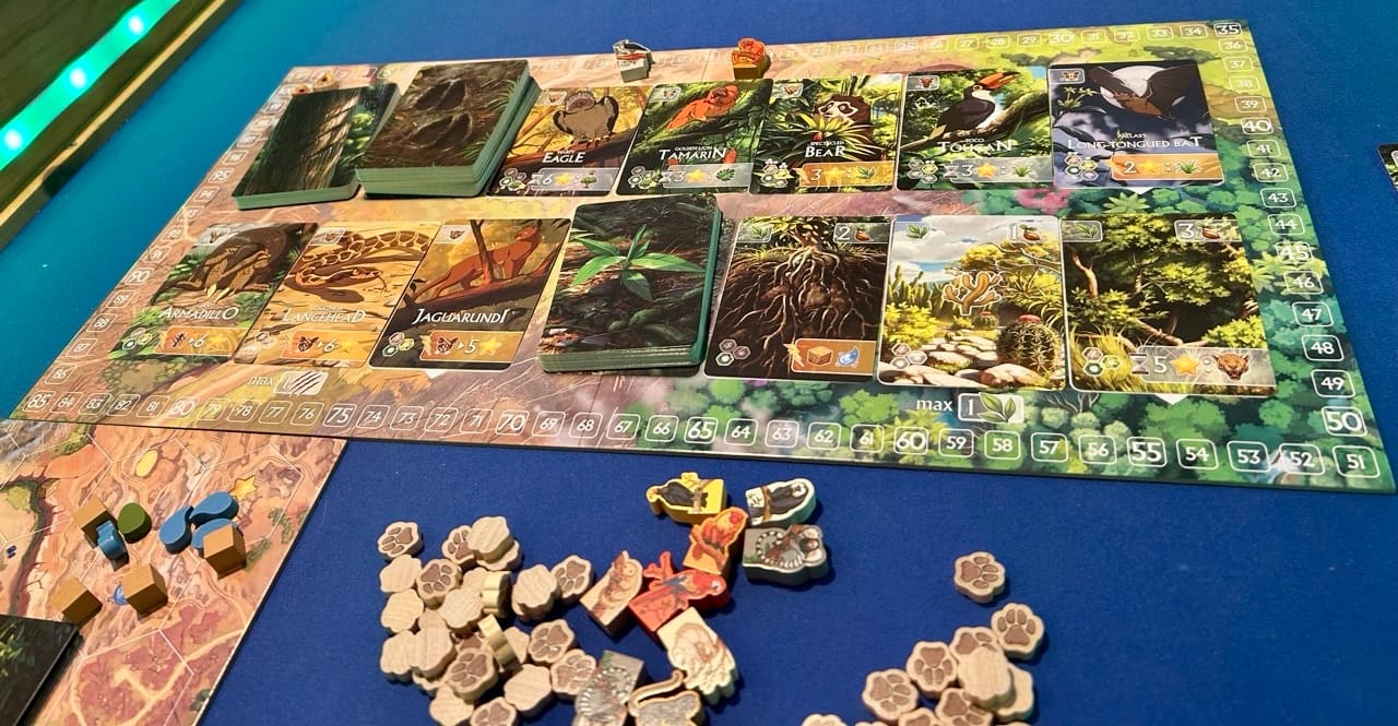 Rewild: South America is a beautiful tableau building game - I mean seriously just look at this art! The key work is in attracting plants and animals to your 3 separate biomes (Scrubland, Grassland, and Rainforest) to make the best point-scoring tableau across the 3.