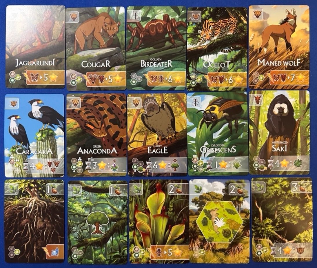 1 I’m careful here to say “Animals with predation effects” because this game carefully distinguishes between animals classified as predators (as opposed to herbivores or insects) and animals that have a predation effect. For example, the Goliath Birdeater is in the predation deck as it has a predation effect asking it to eat insects or small herbivores, but is itself classified as an insect2. Vice versa, the Spectacled Bear is classified as a predator even though its scoring ability is based on plants.