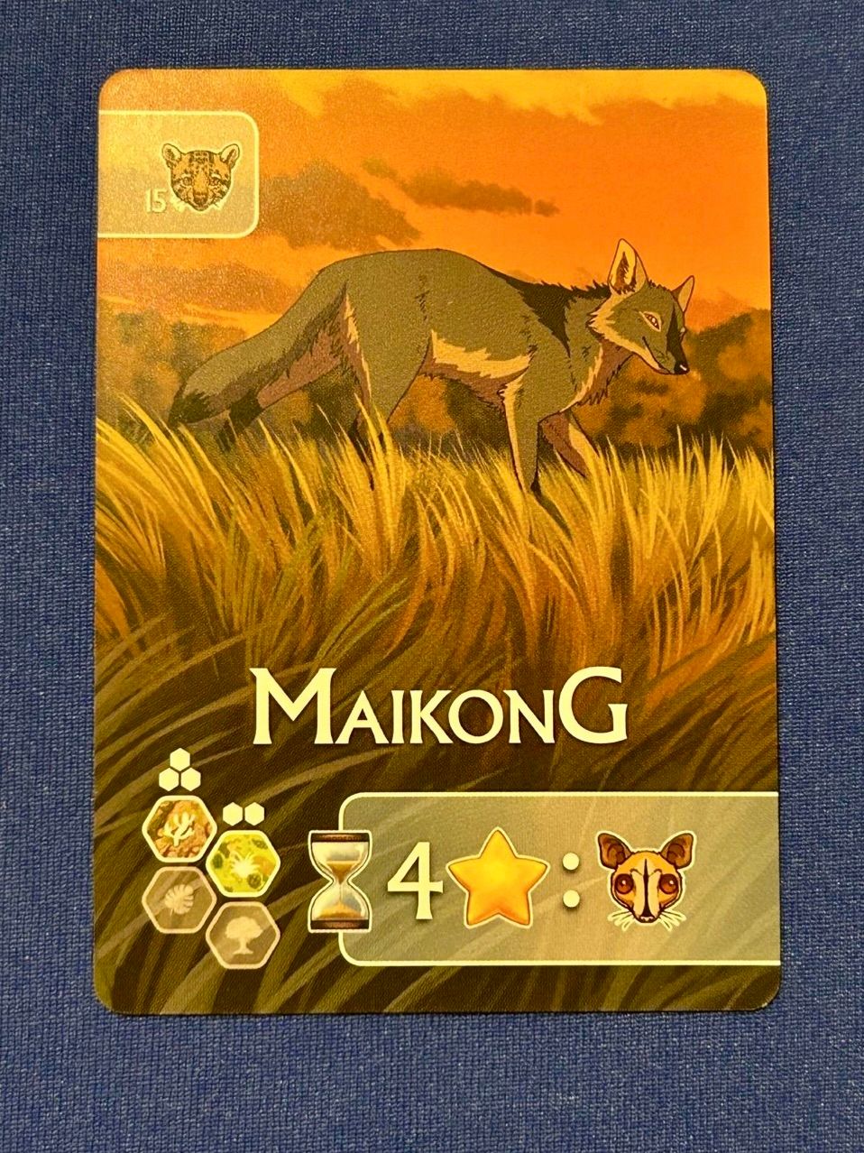 The Maikong is a small predator (top left icon) that scores at the end of the game for each small herbivore present on your board. More than once I’ve mis-read this card as scoring for itself.