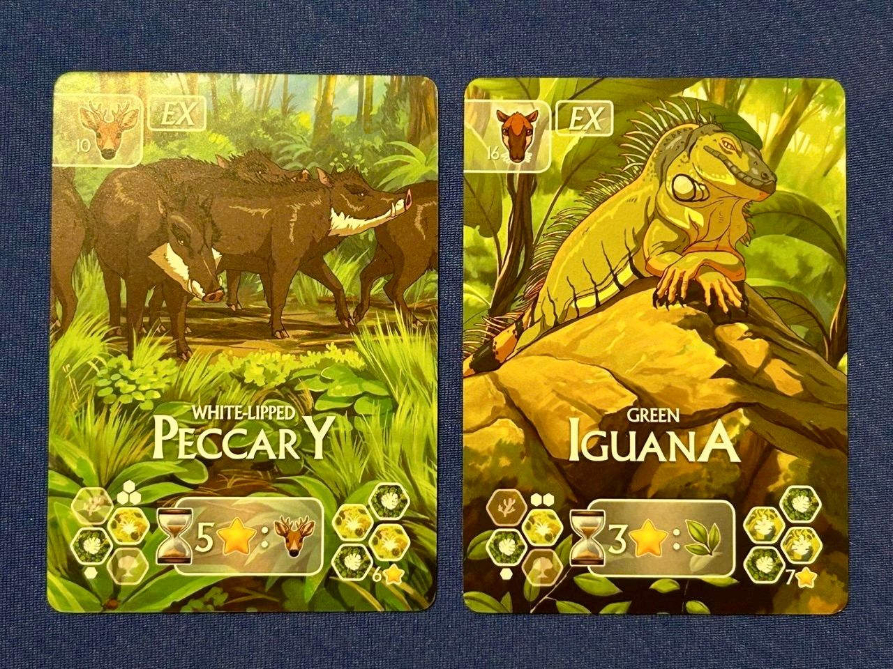 Both the Peccary and the Iguana award placement bonusses (lower right of the card) for an arrangement of four hexes in a diamond shape with rainforest at the extremes. The Peccary wants grassland in the middle, but the Iguana wants wetland. At this scale I’m not sure I can tell.